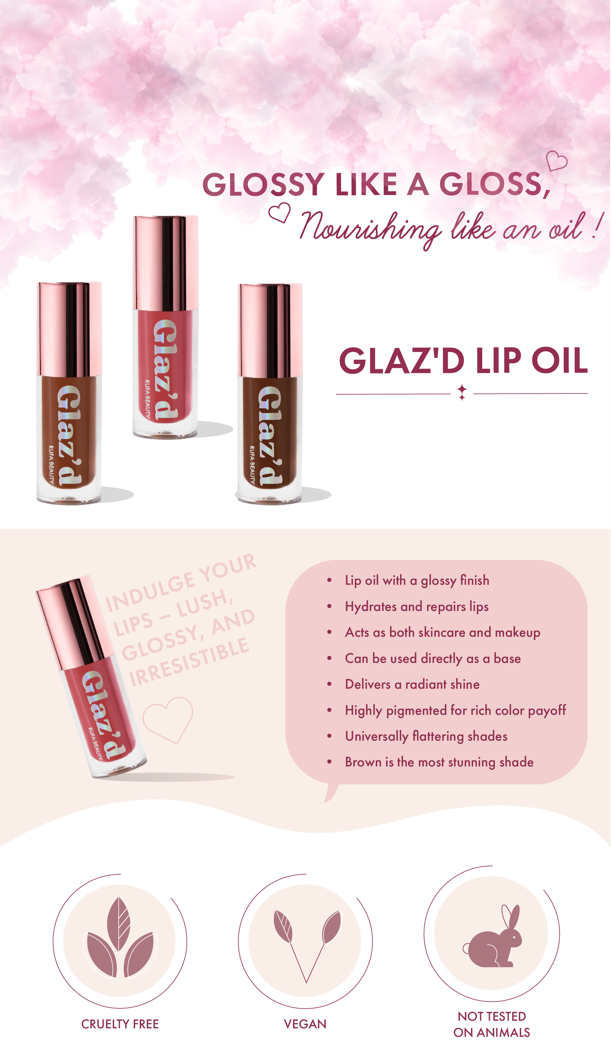 Experience the ultimate lip indulgence with Glaz’d by Rufa Beauty. This luxurious lip oil delivers a glossy, glassy finish, with the thickness of a gloss but the nourishing effects of a lip oil.