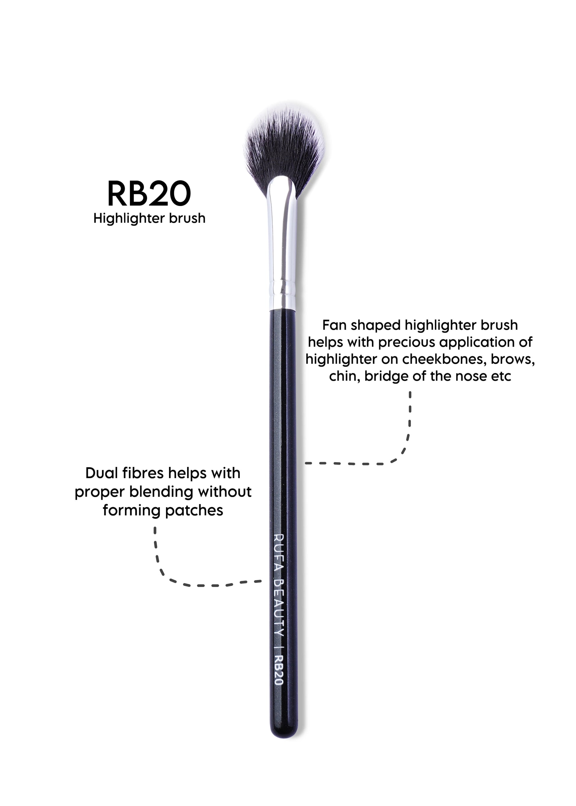 Our DUAL FIBRE highlighter brush is a hybrid between a traditional fan brush and a tapered blending brush. The dual fibers help give you a beautiful blended effect as opposed to patchy look with a normal highlighter brush. The shape also helps you cover area only required to be covered, fitting the high points on cheekbones and chin perfectly. The edges helps with application on the bridge of the nose and brow bones precisely.
